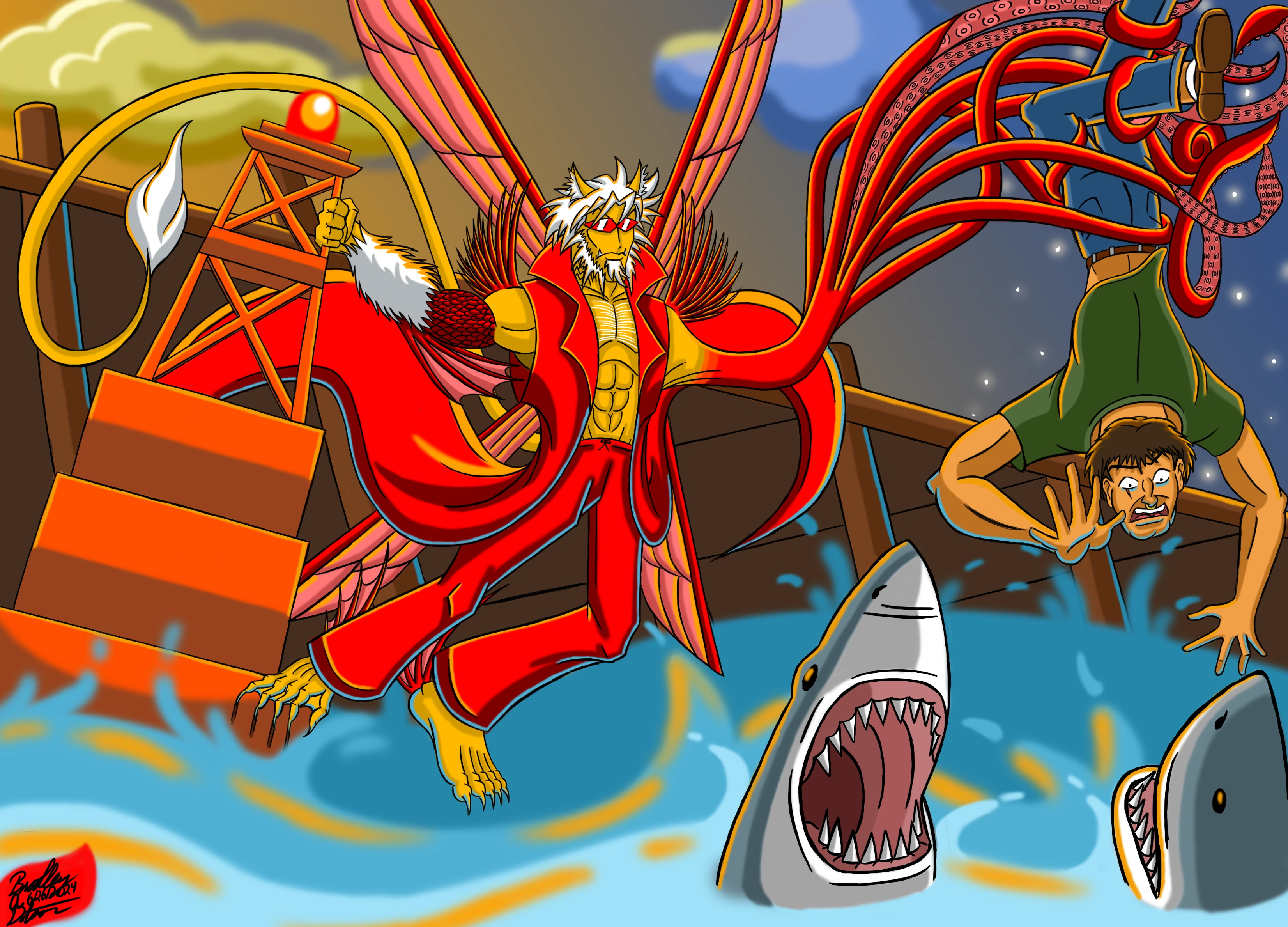 - Amphibious Physiology: The Zoologist possesses a naturally amphibious physiology that allows him to biologically adapt, live, and thrive in any underwater and aquatic environments, conditions, and ecosystems and return to land and into the air at will. Red scales along his neck & throat hide pharyngeal slits (gills) on each side of his neck, as well as webbed extremities (fingers and toes), sleek hydrodynamic skin and proportions, & red razor-sharp indestructible fins on the backs of each of his elbows & ankles allow the Zoologist the ability to breathe, see, speak, hear, smell, maneuver, & swim at superhuman speeds underwater with perfect clarity. His gills & lungs contain oxygen-diffusing membranes, called lamellae, which enable him to create an oxygenated perfluorocarbon emulsion that fills his lungs, equalizes underwater pressures, and extracts sufficient oxygen from ambient water to allow him to breath fluids, oxygenate his body, and function normally underwater. On land and in the air, his alternative respiratory organs supersede his gills, i.e. his lungs. The Zoologist possesses specialized blood circulation and amino acids that allow him to withstand and survive in freezing cold and arctic waters. He is also able to withstand boiling hot water as well, although he must adapt to the temperature extremes otherwise he will be scalded and unable to breathe efficiently. He can safely swim and breathe in any freshwater and saltwater environments and can efficiently swim, maneuver, and function in any body of water or aquatic ecosystem, be it oceans, lakes, rivers, streams, springs, brooks, ponds, pools, fountains, wetlands, bayous, swamps, estuaries, and bogs efficiently. He possesses complete and unrestricted freedom of movement underwater and is a master swimmer and diver, capable of masterfully swimming, gliding, diving, and maneuvering in any style through virtually any body of water or aquatic ecosystem at a consistent speed of 64.79 knots (120 miles per hour) in virtually any temperature, length of time, or depth. He can make tremendous leaps and breaches out of the water and efficiently transition from swimming in the sea to running on land of flying into the air and vice-versa. The Zoologist can transform the entire lower half of his body and legs into that of a fish’s tail for greater speed and maneuverability underwater, making him physically appear akin to a merman. The fins on his elbows & ankles are razor-sharp, indestructible, and useful for maneuvering efficiently underwater and usage in close-quarters combat along with his webbed extremities that aid him in greater propulsion through aquatic environments. He has been seen swimming at 3,000 feet per second. With his incredible speed and maneuverability in the water, the Zoologist is able to create giant whirlpools and waterspouts. He has swum straight up the tallest and most powerful waterfalls in the world without effort. He can quickly execute any turn or maneuver at any angle underwater with ease. He can perform virtually any form of ‘aquabatic’ stunts underwater such as flips, turns, loops, corkscrews, barrel rolling, spins, and swimming upside down, sideways, and/or backwards as easily as he does forward. While swimming at high speeds, his body sheds layers of skin, exposing a virtually frictionless inner skin, rendering him hydrodynamic. The Zoologist is capable of reaching and surviving at the very bottom of the deepest ocean floors and trenches, withstanding and enduring the most tremendous pressures and extreme temperatures of both oceans and space. His body produces gases that push out against the ocean pressures as heavily as they push in, preventing him from being crushed at the deepest depths. His body contains fluids that adjust to give him buoyancy at varying depths. His metabolism is extremely efficient, protecting him from the effects of nitrogen narcosis, decompression, the bends, becoming waterlogged, or other deep-sea ailments common to humans, and allowing him to resurface at any speed without harm. His vision underwater is augmented by large optical apertures, improved retina composition to detect weaker light over a larger spectral range, and more photo efficient optics in his eyes, allowing him to see through thousands of fathoms of a clear sea and through even the murkiest and darkest depths of water, and improved neurological filtering which is more tolerant of noise. He has heard while traveling underwater the songs of whales and felt the movements of whole schools of fish halfway across the world. He possesses a sensitive network of nerve endings beneath his scales that transmit information that allows him to navigate underwater even in total darkness. By taking the underwater tactile abilities of the order Crocodilia (crocodiles, alligators, caimans, and gharials), the clade Pinnipedia (seals, sea lions, and walruses), and the order Sirenia (manatees and dugongs), the super-sensitive nose of the Condylura cristata (star-nosed mole), and the echolocation and sonar abilities of the parvorder Odontoceti (toothed whales) and the suborder Microchiroptera (microbats), the Zoologist can sense the presence, movement, and location of objects anywhere in his surrounding environment through vibrations in the water and changes in currents, water temperature, the environmental conditions, and even tidal forces. His superhuman senses of sight, smell, taste, touch, and hearing compensate for his underwater environment to remain as acute and accurate underwater as they do on land and in the air, granting his senses perfect clarity underwater, even in the deepest darkest trenches and abysses. He has demonstrated lifting a sinking cruise ship from the ocean floor, outswimming a speeding torpedo and forcing tremendous pressure on it to explode it from afar, leaping onto the deck of a large cruise ship with ease from beneath the waves, biting through the haul of a nuclear submarine, swiftly traversing an